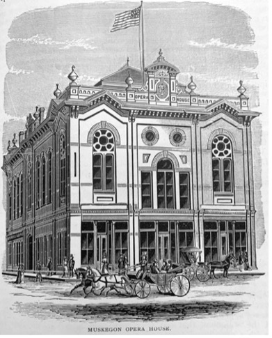 (Sources: Sketch of Opera House from Muskegon and It’s Resources (Muskegon Board of Trade); Findagrave.com; Ancestry.com; Street Names of Greater Muskegon (Mark Okkonen); Genealogybank.com; photo of Fred L. Reynolds from the Local History & Genealogy Dept. of Hackley Library photo collection,; Muskegon Chronicle; The Many Lives of Muskegon (Yates & Hornstein).