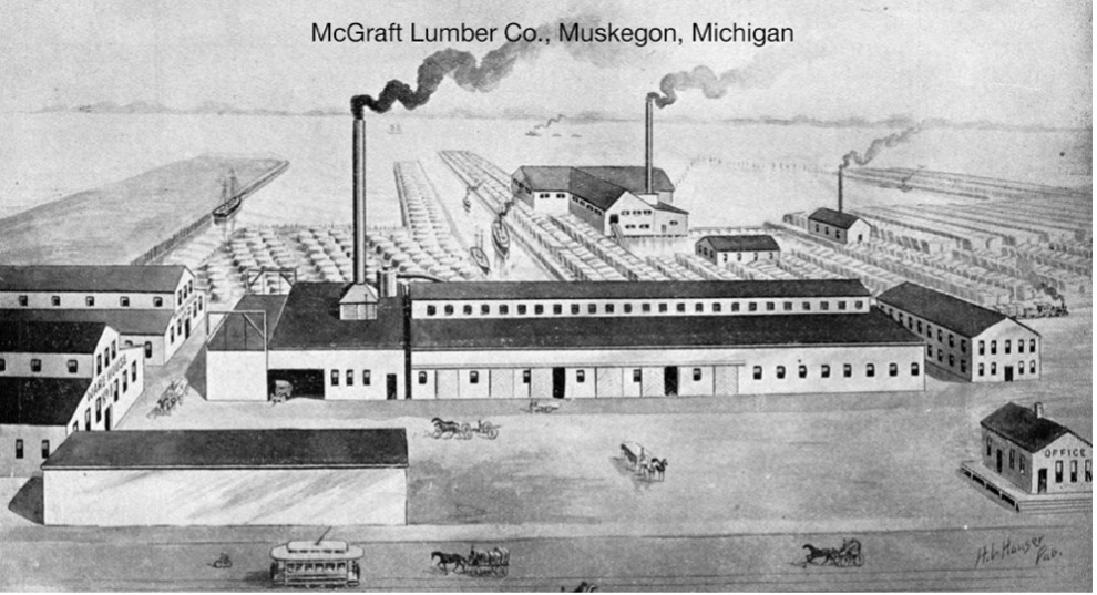 In 1871, he moved to Muskegon and started working for Charles Merrill and Thomas W. Palmer of Detroit, handling their lumber interests here. (Mr. Palmer would later become a U. S. Senator.) In 1874, he partnered with A. S. Montgomery to form “McGraft & Montgomery”. In 1875, they purchased the old saw mill built by George Ruddiman in 1849. They made improvements to the mill and with new equipment, it became one of the most successful lumber mills in Muskegon. They also owned 2 lumber yards in Milwaukee, Wisconsin. Over the years, Newcomb purchased vast amounts of property not only in Michigan, but in other states too. From 1881 to 1883, Newcomb served as the President of the Muskegon Boom Company. His early days of working on the river made him perfect for the job. He was well respected by his fellow lumbermen, his own employees, and the men working for the Boom Company, after all, he had been “one of them”. Then, during the lumber strikes in 1882, two striking workers (not from his employ) came onto his mill property trying to talk his men into joining the strike. When the men refused to leave, he had a physical altercation with them. After that incident, there was a complaint made against him by the “working man’s committee” (representatives for the striking workers). He tried to resign as President of the Boom Company, thinking that it might ease the tensions during the strike, but the other board members refused to accept his resignation. (It wasn’t until 1883 that his resignation was accepted.) In June of 1882, the partnership of McGraft & Montgomery was amicably dissolved. In the winter of 1882, Newcomb started another mill in Lakeside called “McGraft Lumber Company”. He served as President and Treasurer, Thomas W. Palmer was Vice President, George D. Smith was Secretary and W. S. Gray was Superintendent. This proved to be another very reputable and profitable business for all concerned.