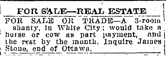 In 1917, according to the Chronicle, “The tracks of a one-legged man using crutches, two chicken heads lying in front of the accused house, and two chickens broiling on the stove” was the evidence the Sherriff needed to charge Pete Christian, a squatter at White City, with chicken stealing. The crutch marks in the snow made it easy to track Pete and his two accomplices from Mrs. Hutton’s home, where the chickens had been stolen, to Pete’s house.