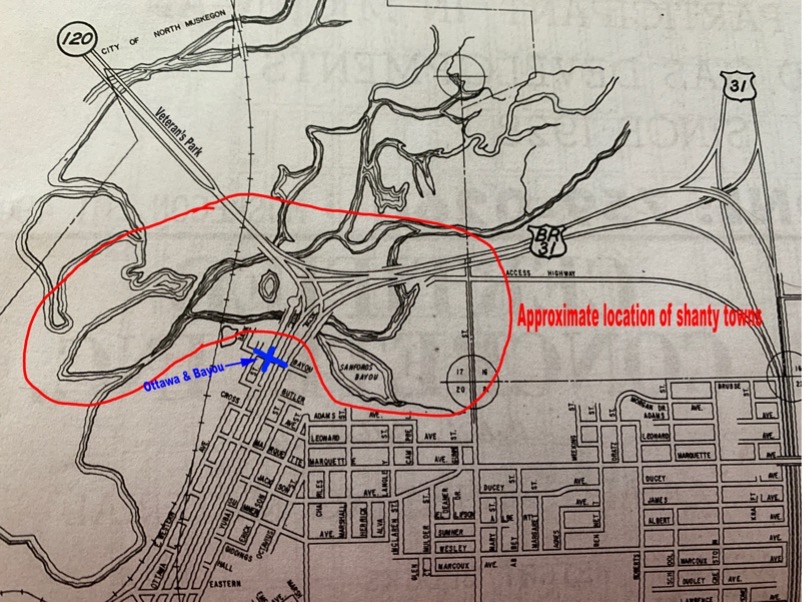 There was an old road and bridge that connected Muskegon and North Muskegon before they put in the causeway or US 31. It seems the road had a few different names throughout the years, such as Old Bridge Road, Old State Rd to Whitehall, Old North Muskegon Road, Corduroy Road, etc. The shantytowns used that old road as a point of separation. They jokingly referred to the land west of the road as “Coney Island” and the east side as “White City”. I said jokingly because Muskegon’s White City and Coney Island were the furthest thing from resort areas or amusement parks that you could imagine.